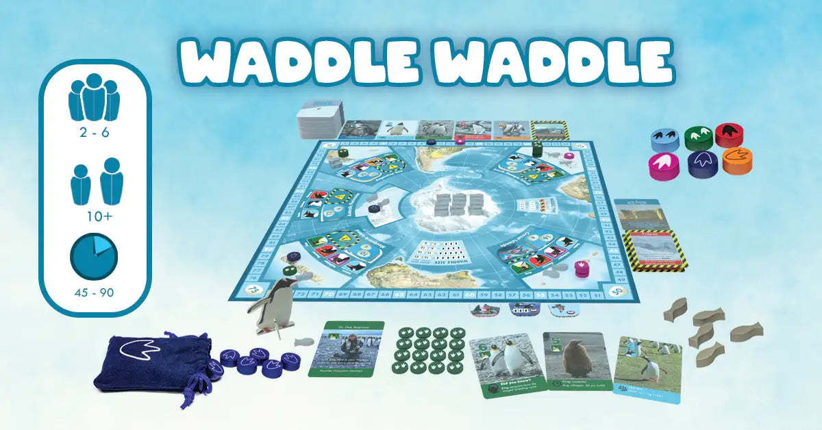 Waddle Waddle is a penguin-themed board game that's perfect for family game night. It's accessible enough for younger games but with enough depth and strategy to satisfy even hardcore gamers--Waddle Waddle is the rare game that's fun for the whole family! Waddle Waddle is destined to be the classic penguin board game on your shelf.